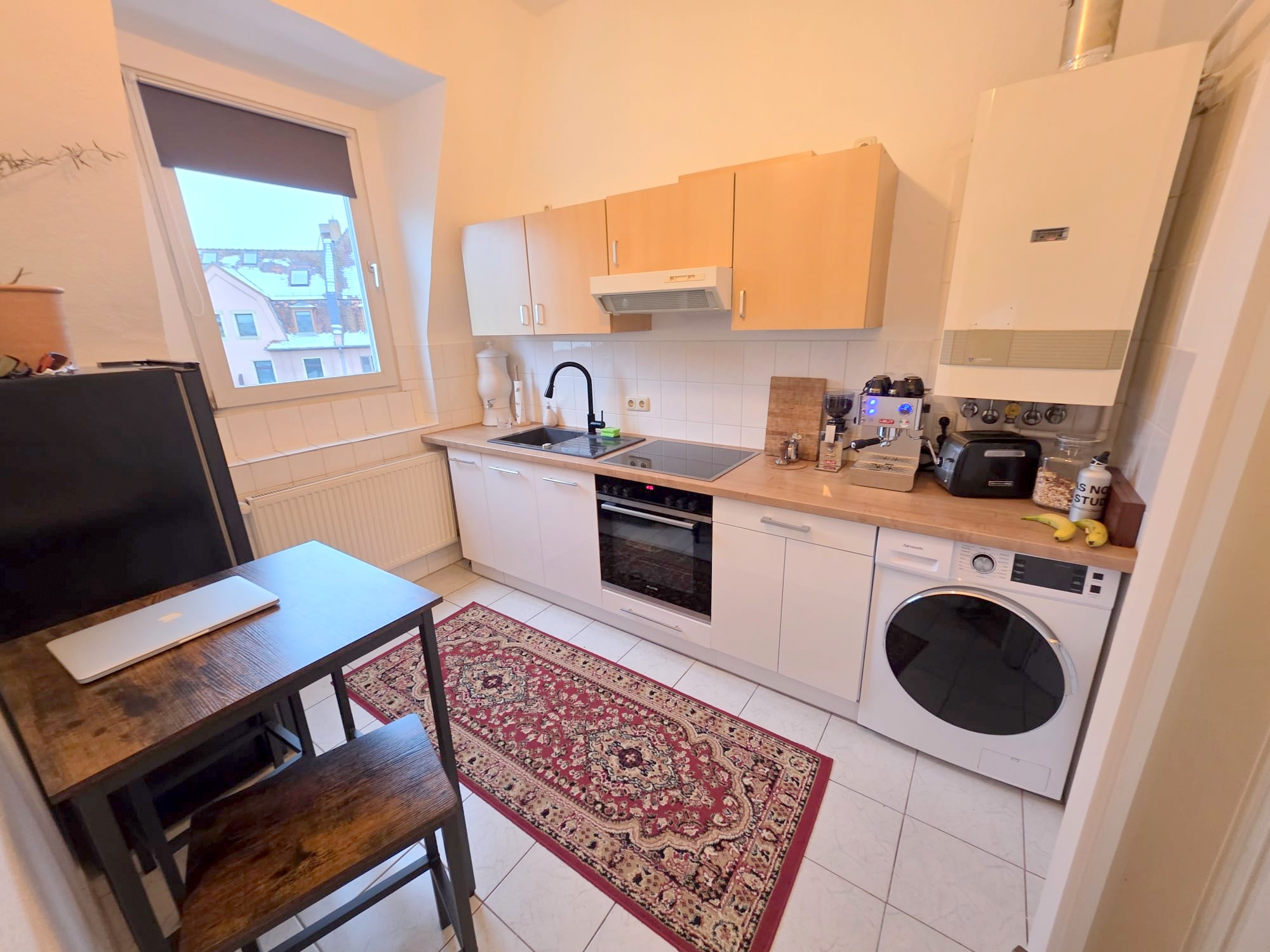 Die Küche vom jetzigen Mieter mit einer kompletten Einbauküche inkl. Kühl-/Gefrierkombi, Spüle, Ceranfeldherd + Backofen + Dunstabzugshaube sowie Waschmaschine ausgestattet, die vom derzeitigen Mieter gegen Abstand € 1.400,- übernommen werden kann und es bleibt sogar noch Platz für den kleinen Frühstückstisch.