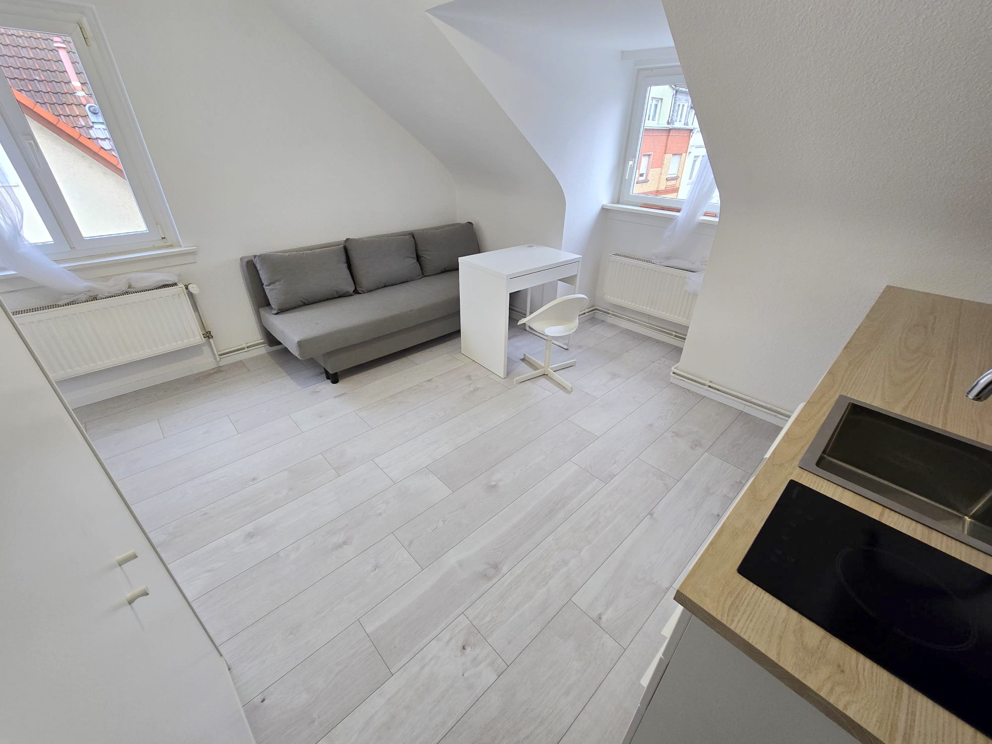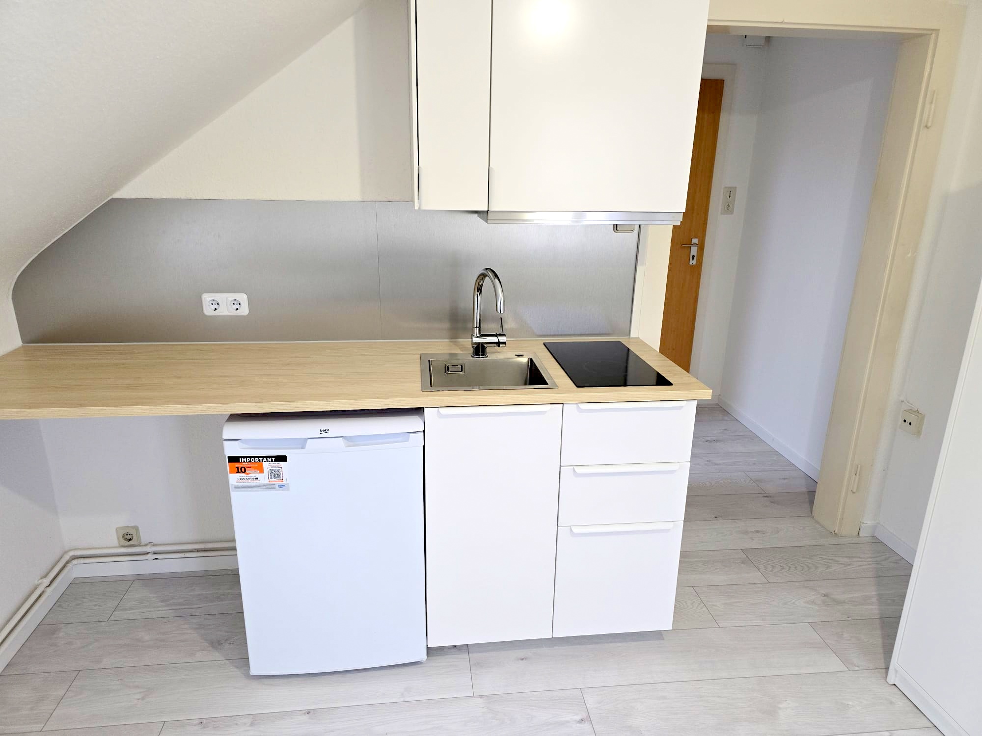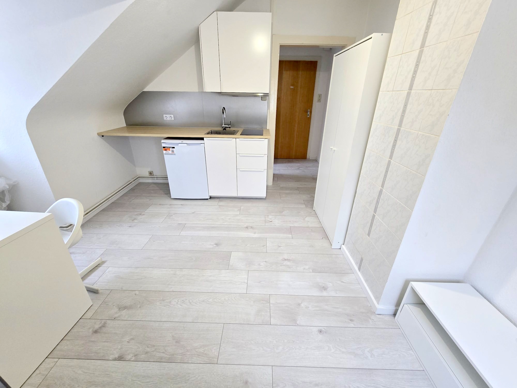 Sie betreten die Wohnung im 3. OG = DG in einen kleinen Flurbereich, von diesem sind das Tageslicht-Wannenbad und das Wohn-Schlafzmmer mit integrierter neuer Einbauküche zu begehen.
