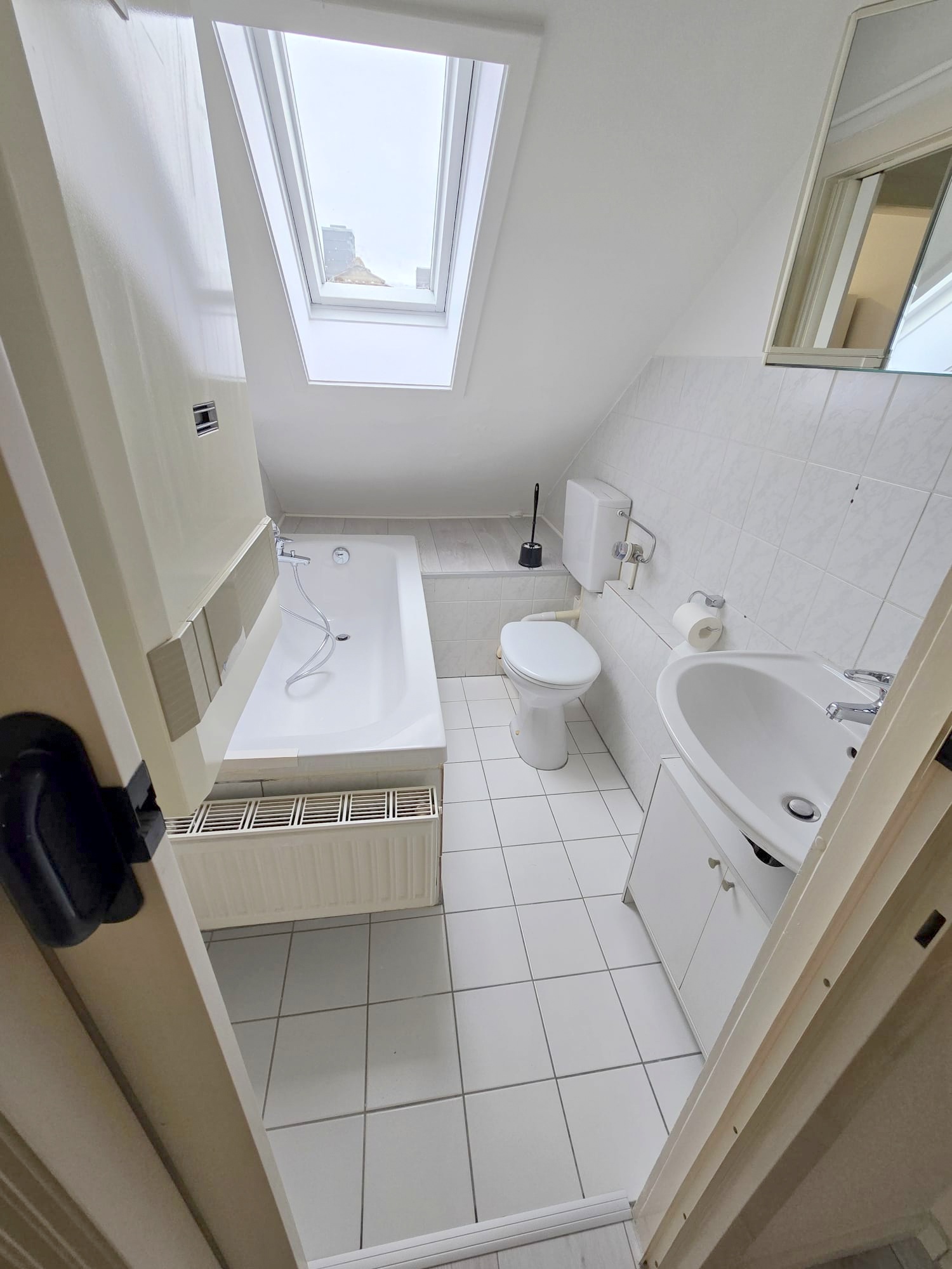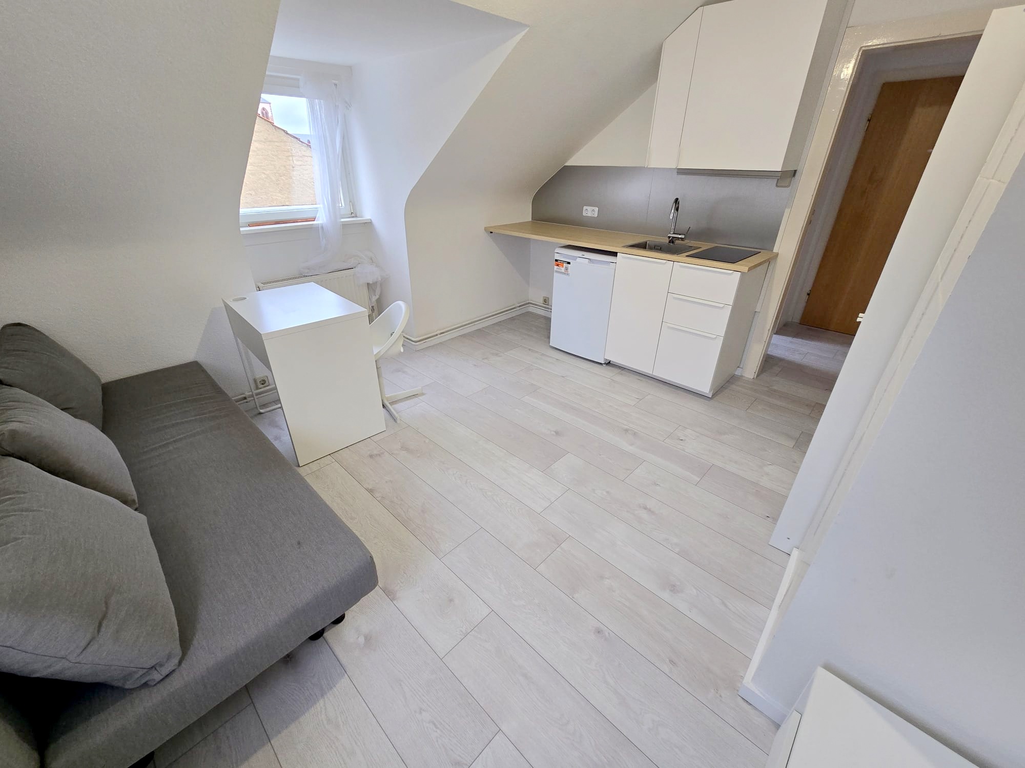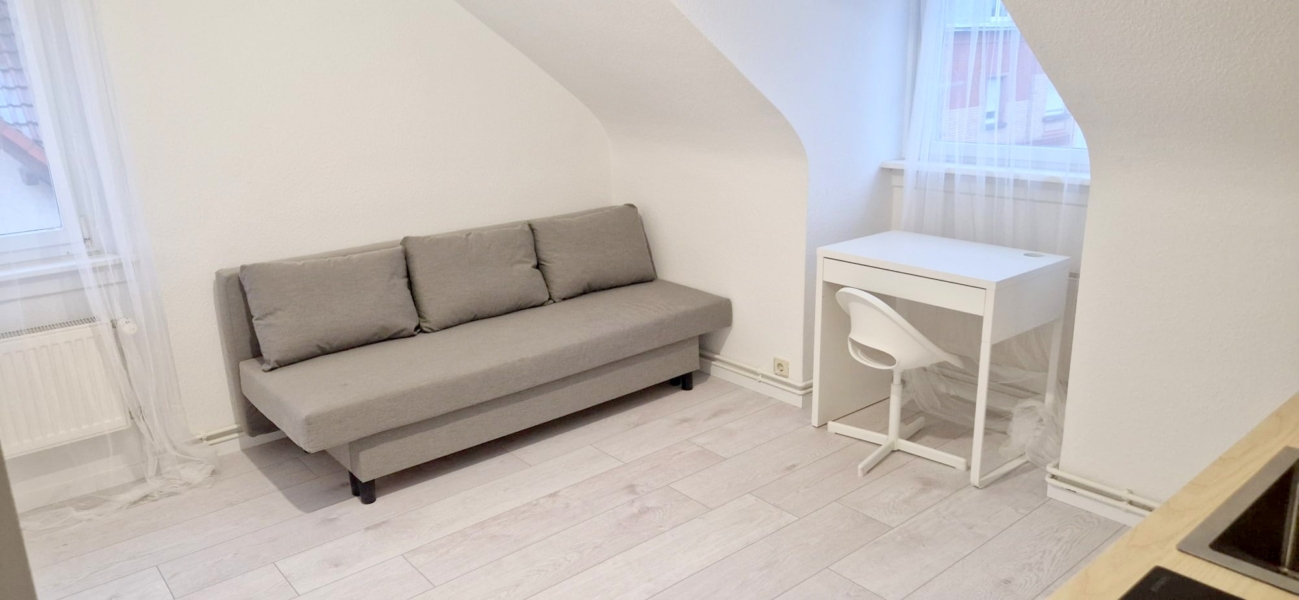 Sie betreten die Wohnung im 3. OG = DG in einen kleinen Flurbereich, von diesem sind das Tageslicht-Wannenbad und das Wohn-Schlafzmmer mit integrierter neuer Einbauküche zu begehen.