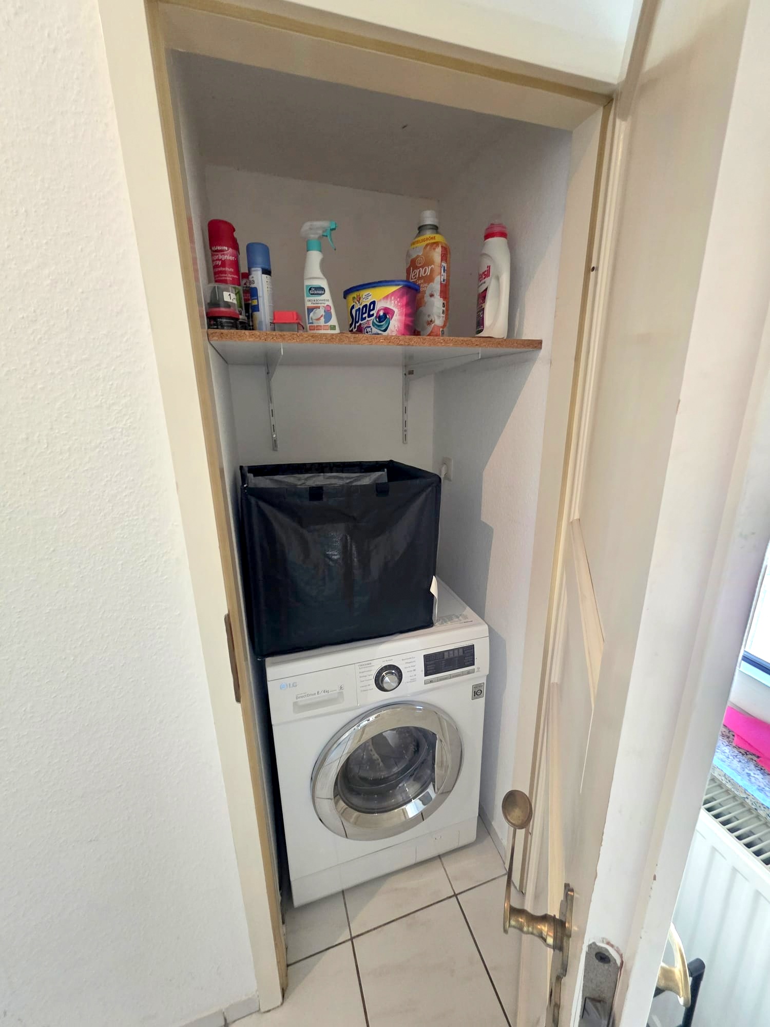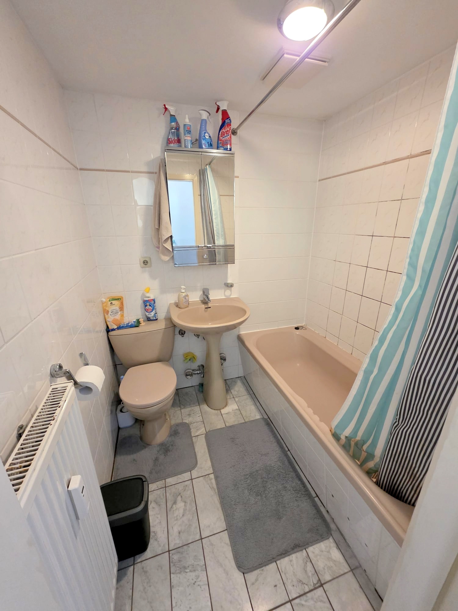 Der Boden ist pflegeleicht weiß gefliest, die Wände sind Raufaser weiß tapeziert.