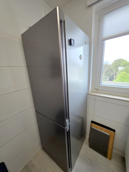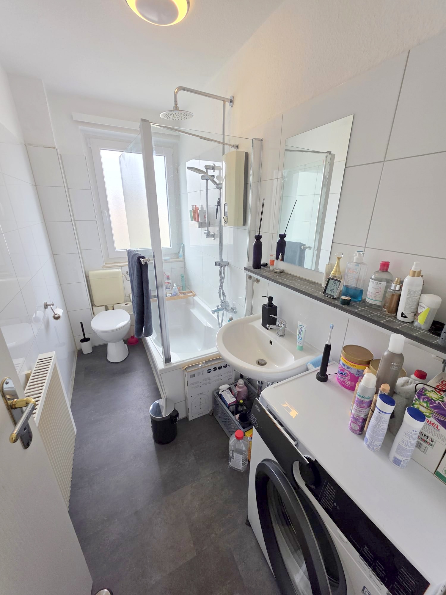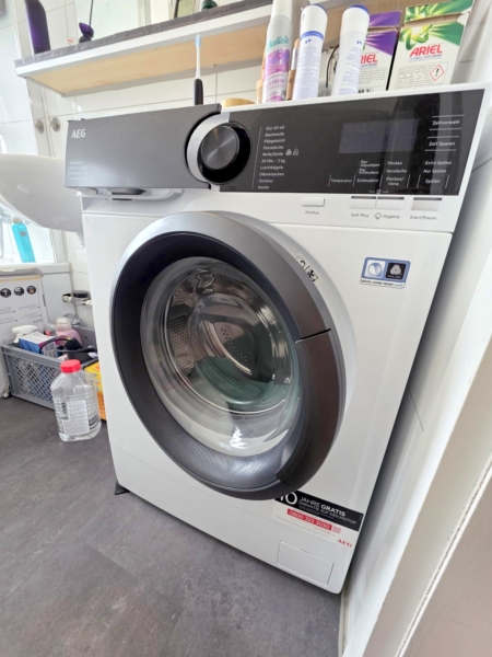 Auch die neuwertige (4/2025) 7kg AEG Waschmaschine (mit Sondermaß im Bad passend) kann gg. Abstand von 400,- (NP