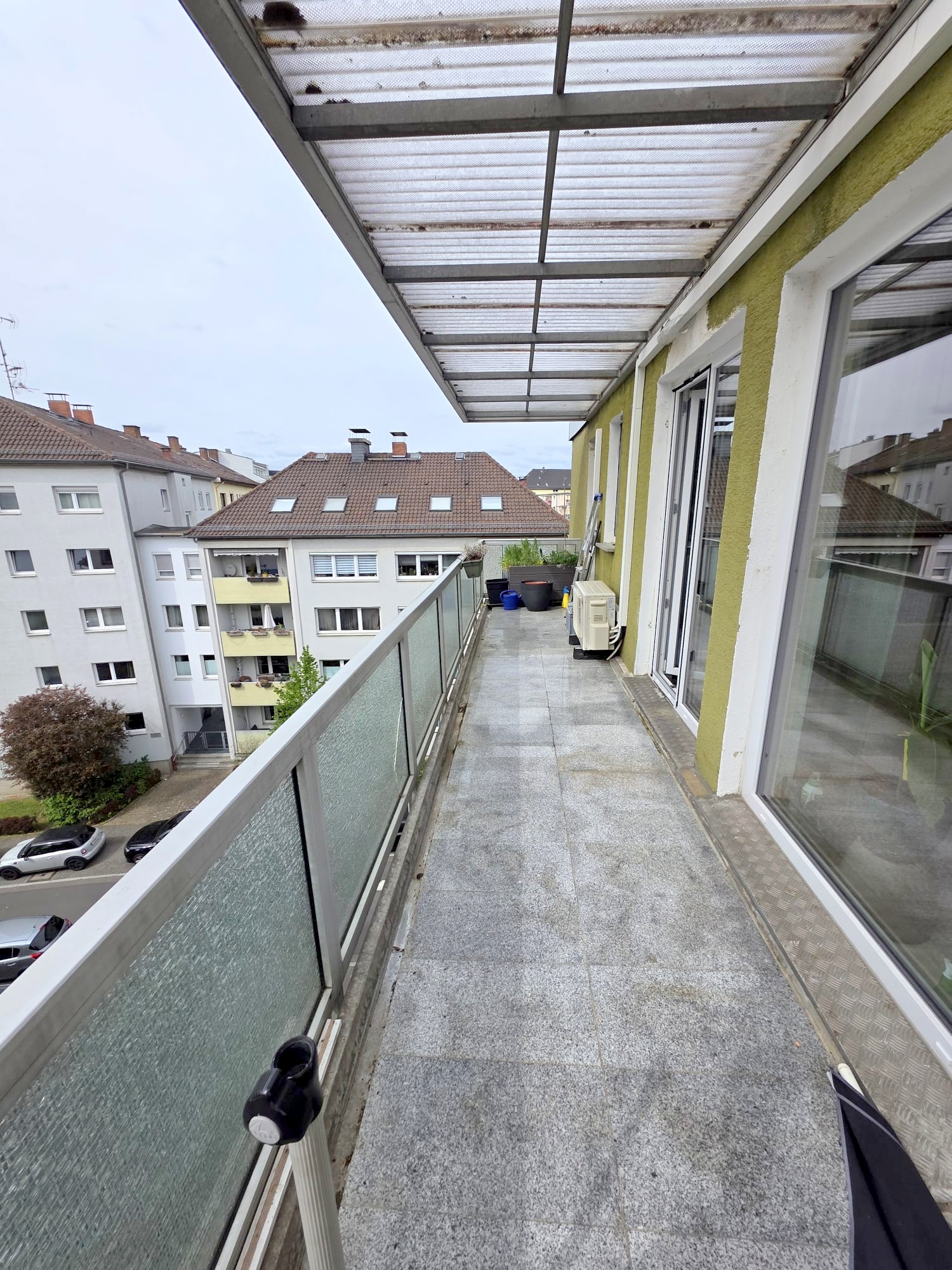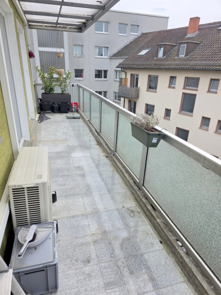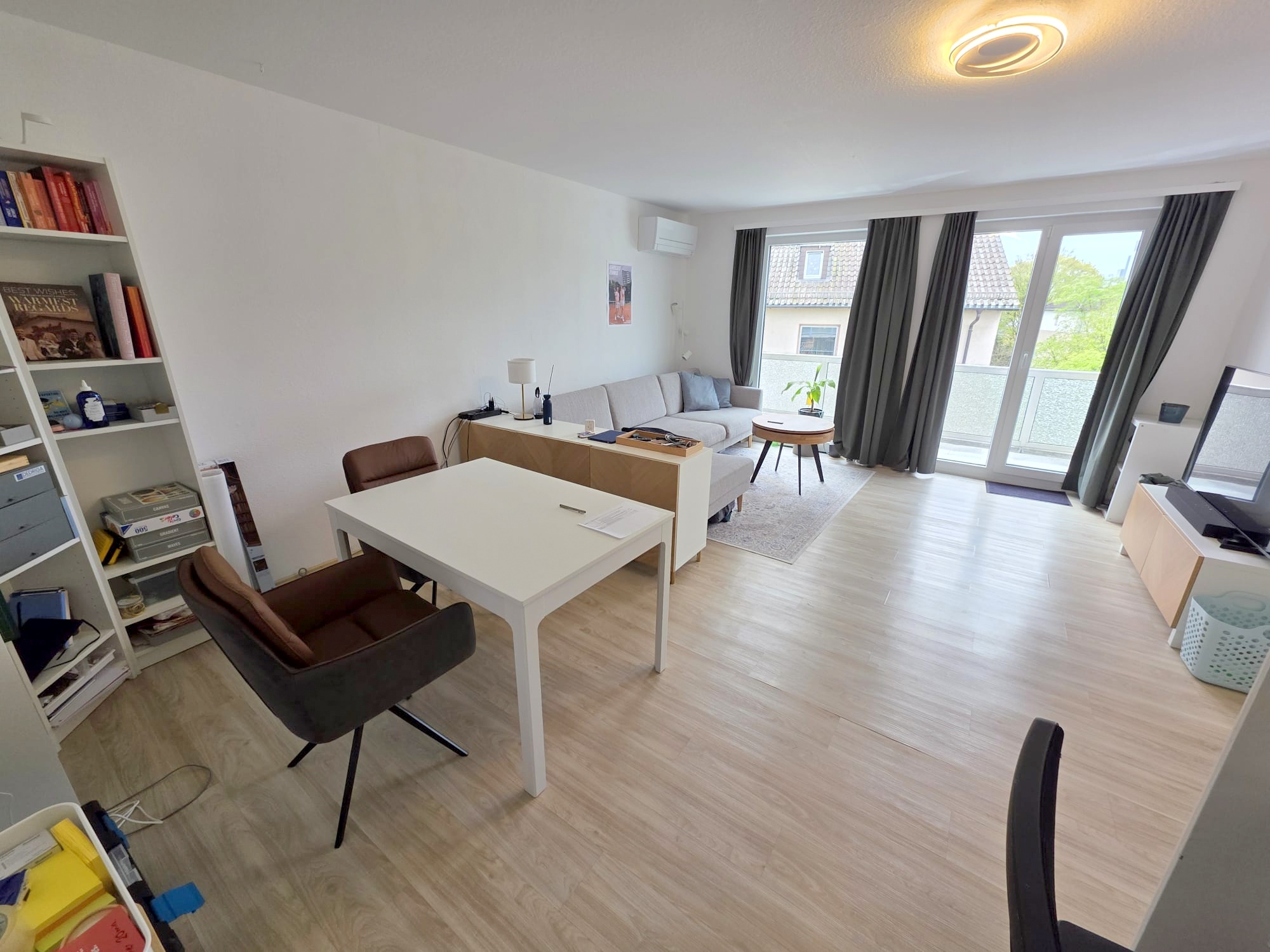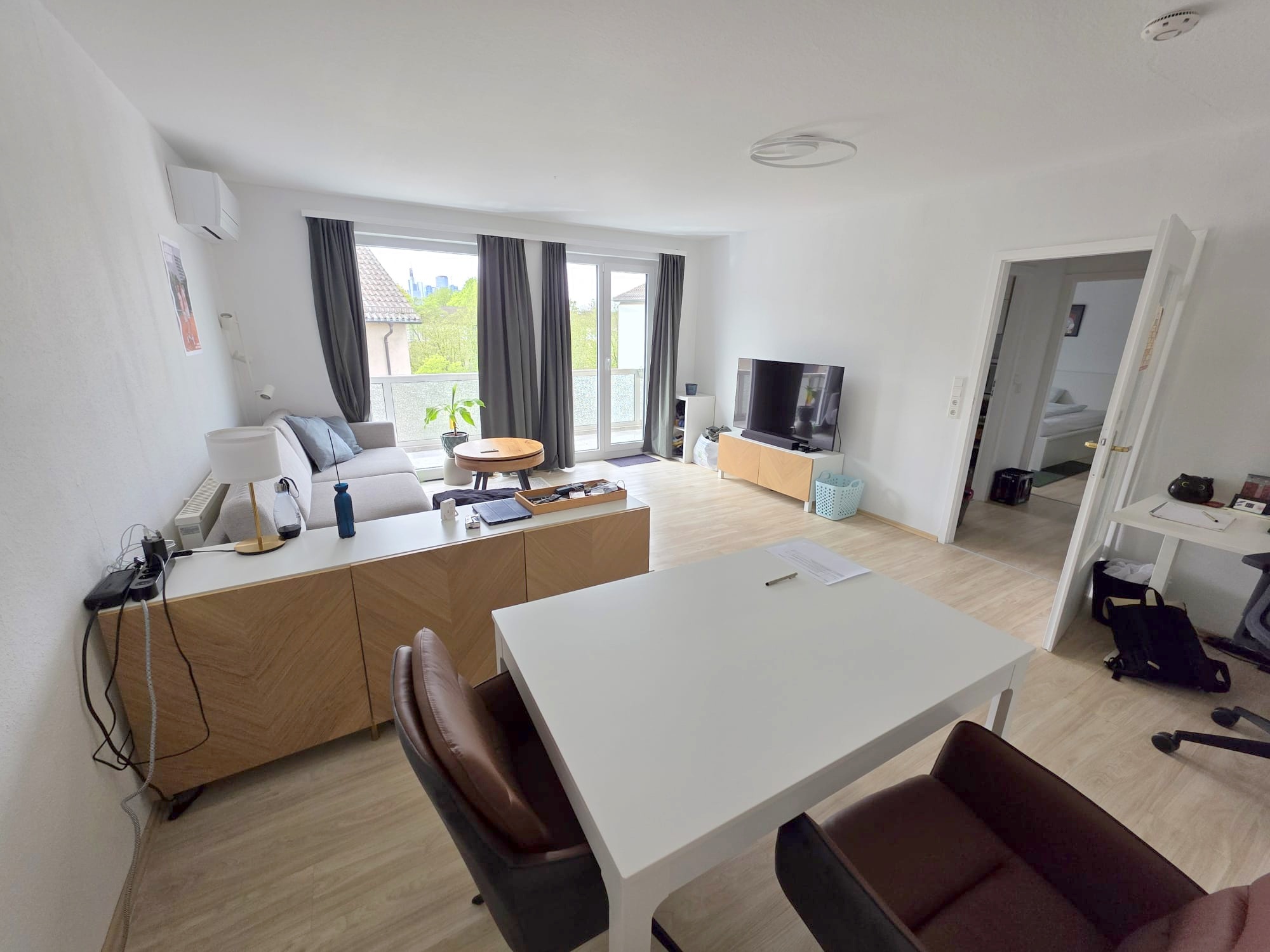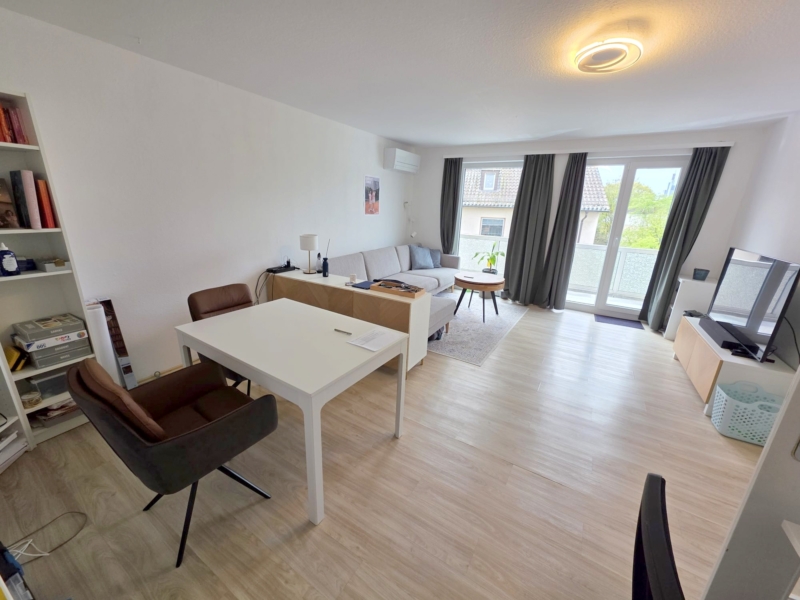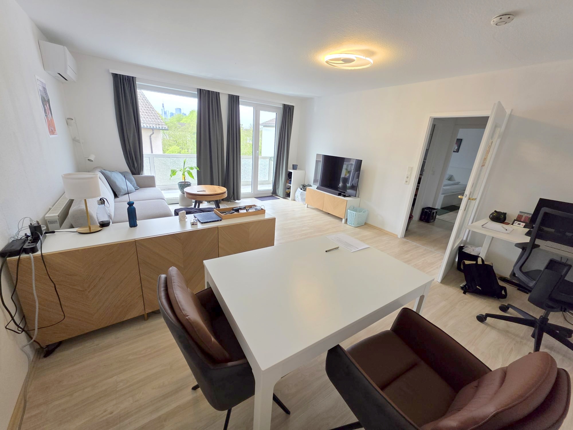 Das Wohnzimmer sehr geräumig und mit genügend Platz um Essen und Wohnen + ggf. noch homepoffice gut zu verbinden. Von hier aus auch der Zugang zum richtig großen Süd/Westbalkon inkl. Skylineblick. Die derzeitigen Pflanzkübel können vom jetzigen Mieter ohne Abstand übernommen werden.