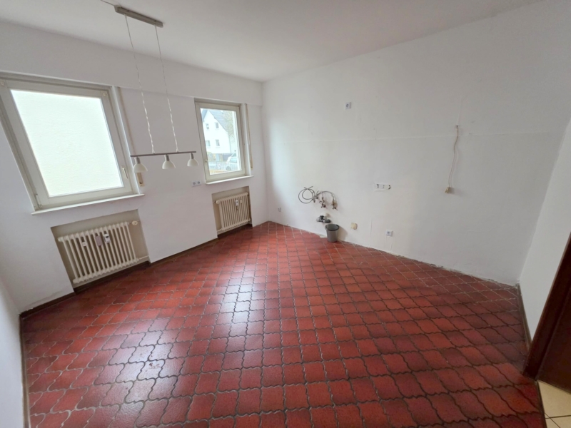 Die Küche mit einem retro-roten Fliesenboden bietet ausreichend Platz und auch die Anschlüsse, so dass Sie Ihre eigene Einbauküche hier ganz nach Ihrem Geschmack einbauen können.