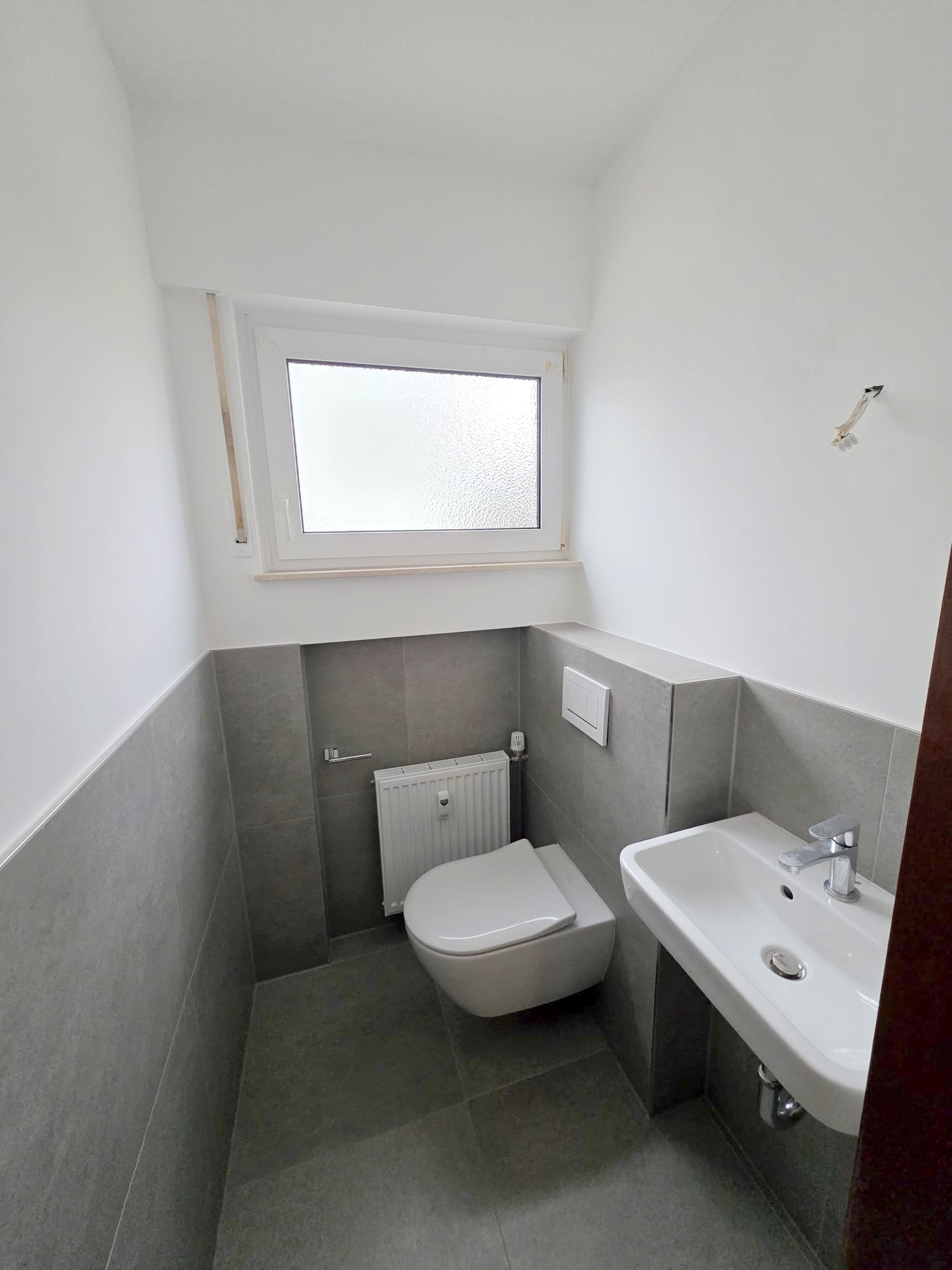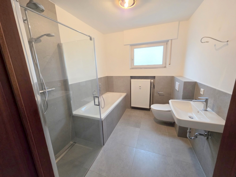 Das Bad und das danebenliegende Gäste WC wurden 2024 komplett neu saniert, somit erwartet Sie ein nagelneues, modernes Bad mit großen schicken Fliesen und neuer Badewanne + Dusche + WC + Handtuchheizung in grau/weiß bei Einzug.